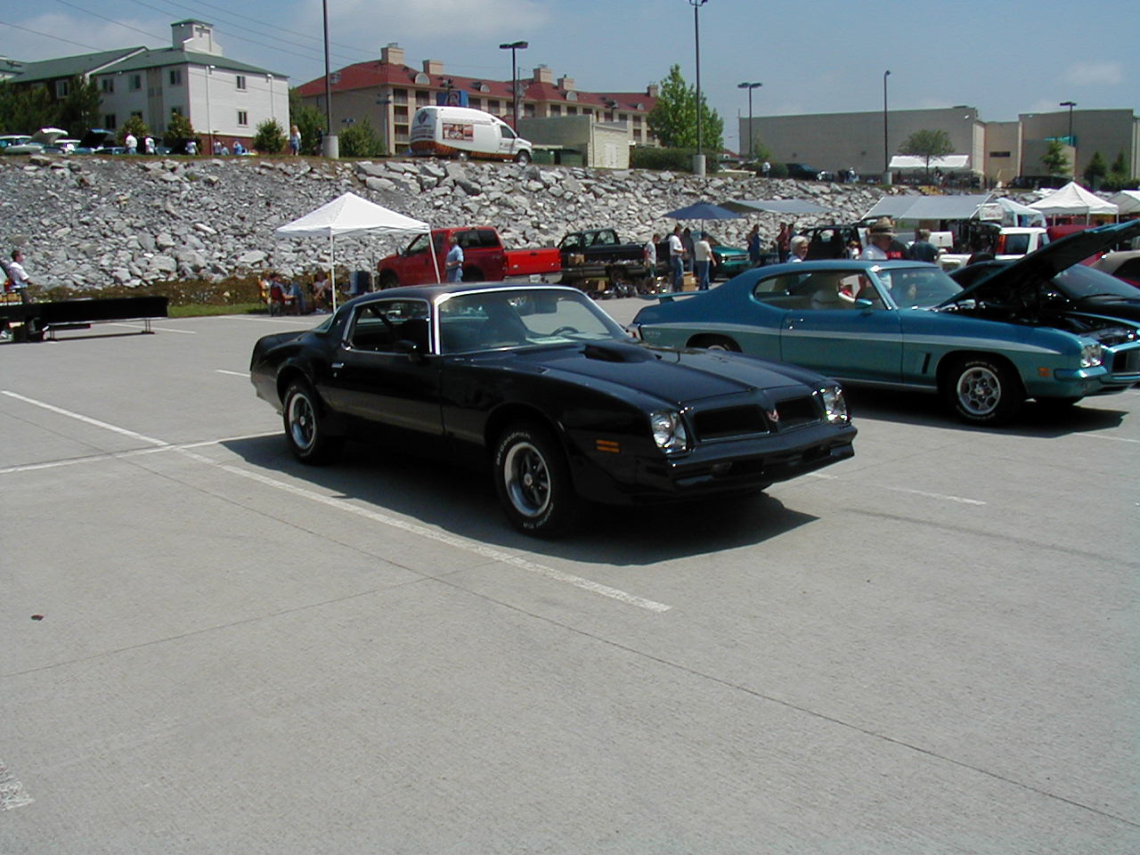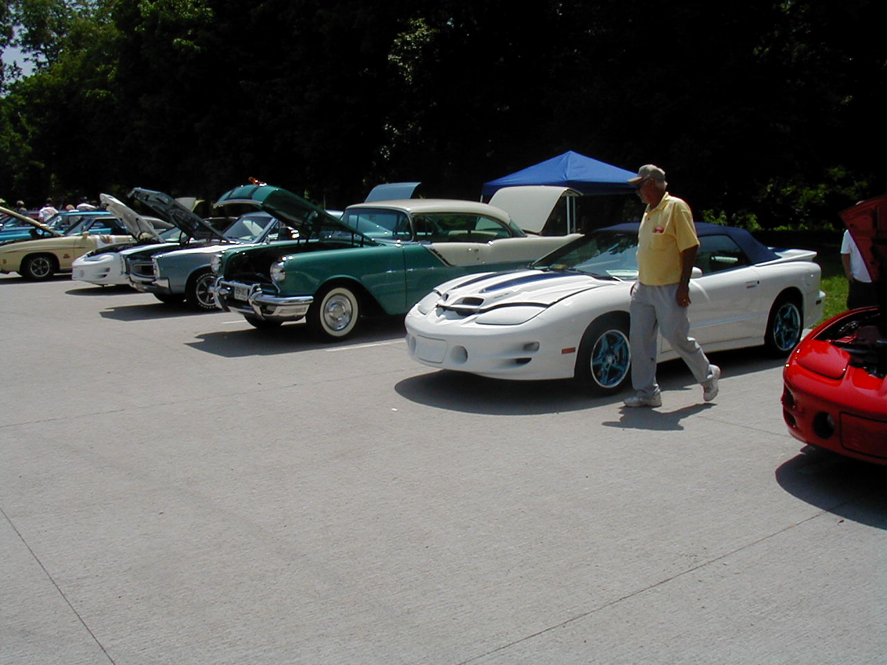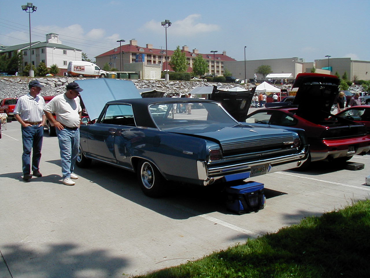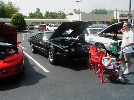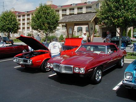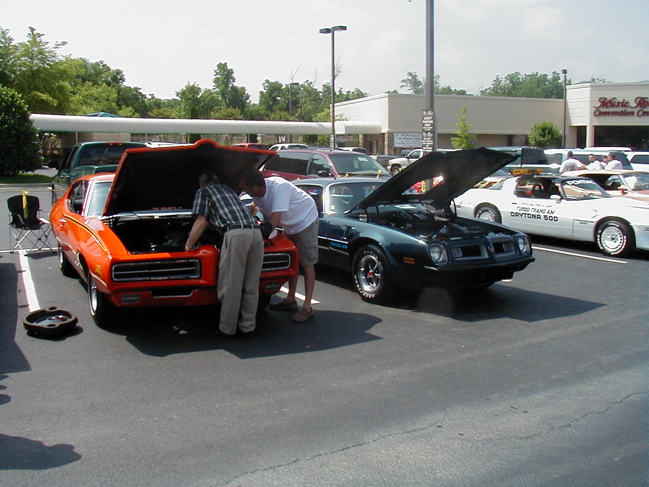 | Look at the great color schemes on these two 1rst-gen Convertibles. Nice, huh? | These two guys are discussing the routing of hard lines under the ram air setup (see it sitting on the ground?) That's part of the fun of car shows. |