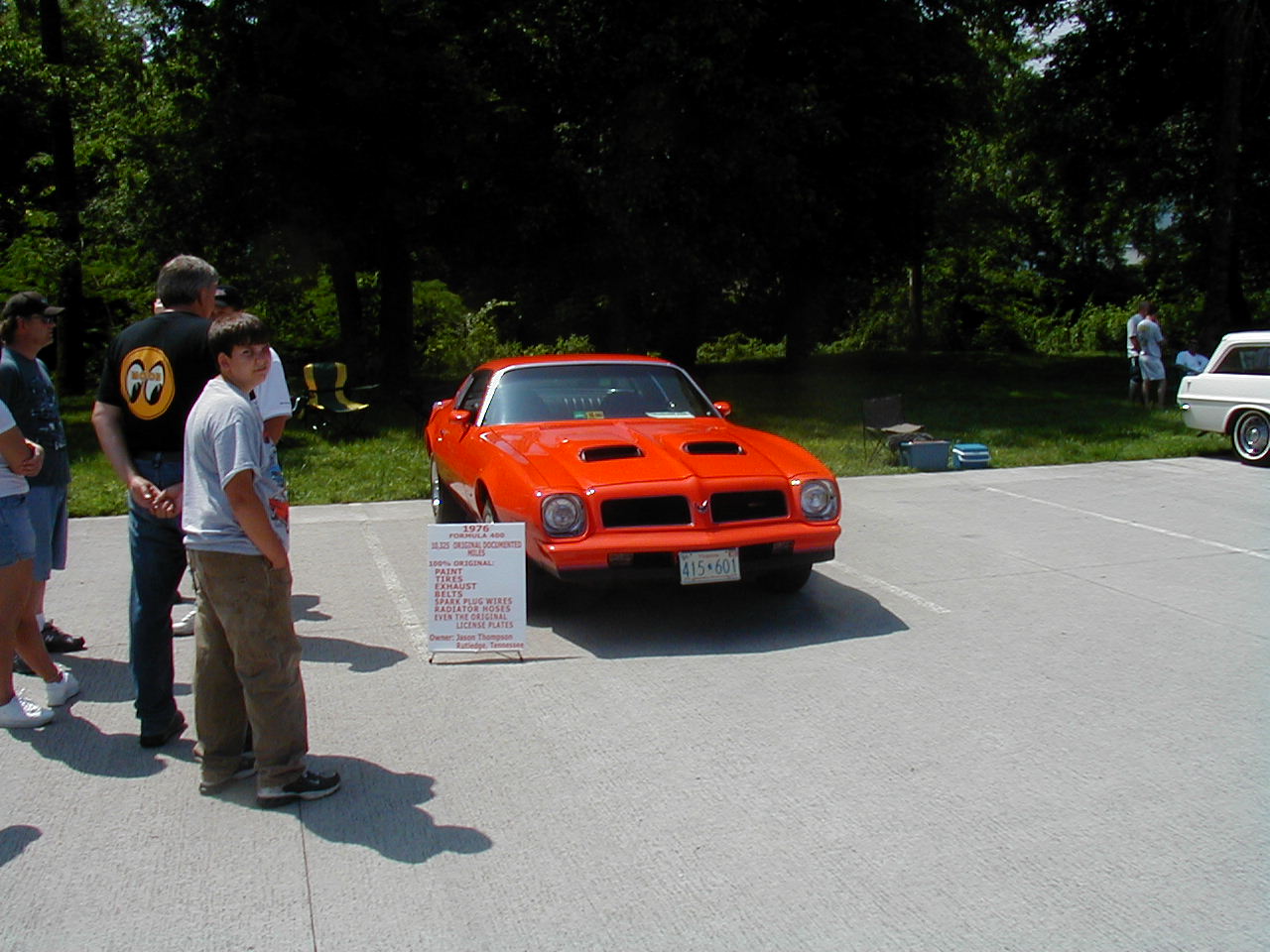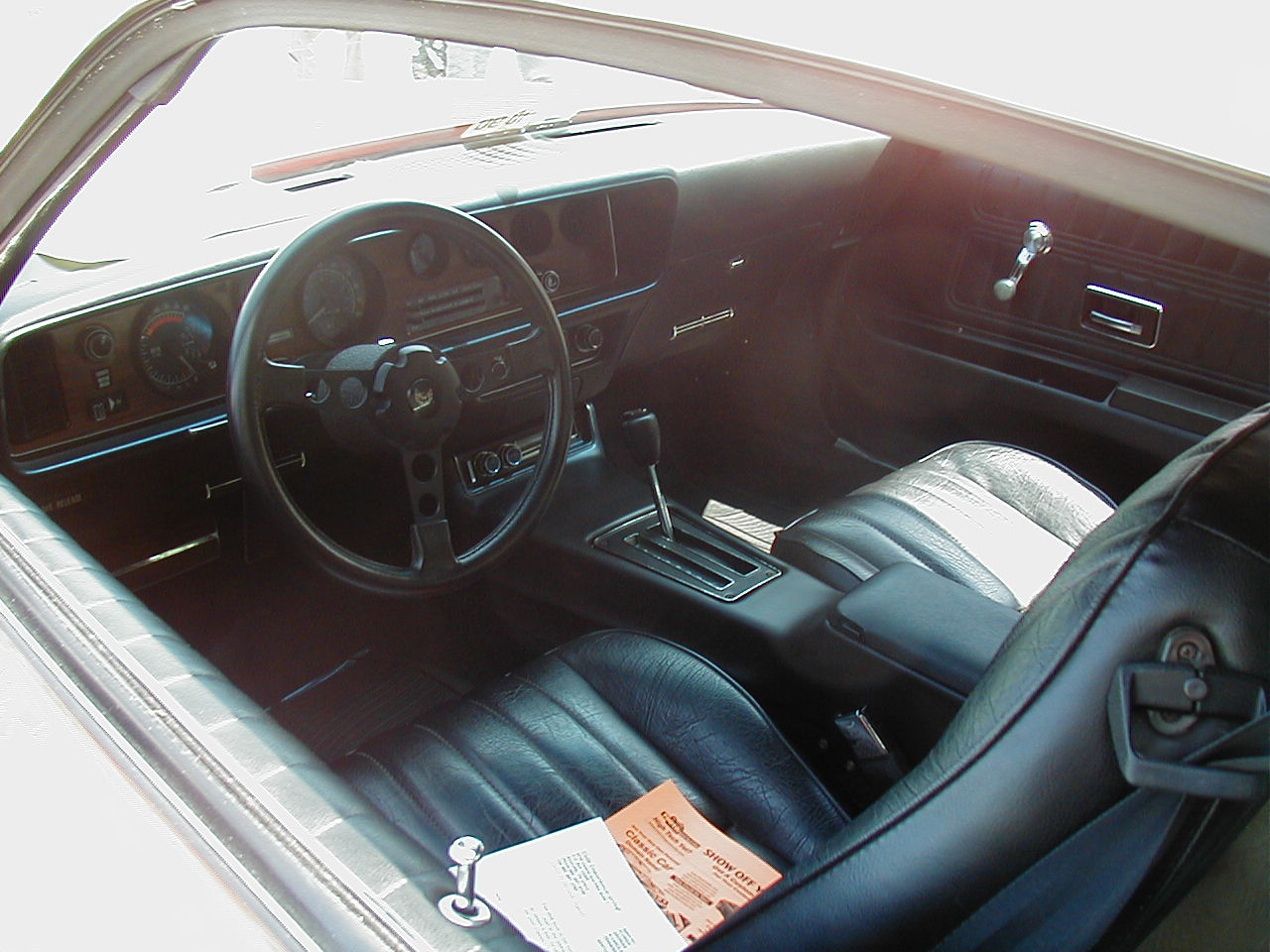 | I was happy to see that the 10,000 mile 1976 Formula was sold to somebody who appreciated it; Jason Thompson. The Thompsons had to replace the master cylinder and get the throttle shafts unstuck. They rotated the original tires (first time ever!) and they report the car runs and drives great. The paint on the car is just excellent, amazing for 30-year-old lacquer. | The interior on this car was amazing - it's perfect. As perfect as I ever expect to see, anyway. This picture doesn't show it too well. It was ordered with the 400, rear spoiler, W50 appearance package, radio and 8-track, air conditioning, 8-grand tach, formula wheel, and rain gutters (they're mylar!) Check out those floor mats, if you can see them. |