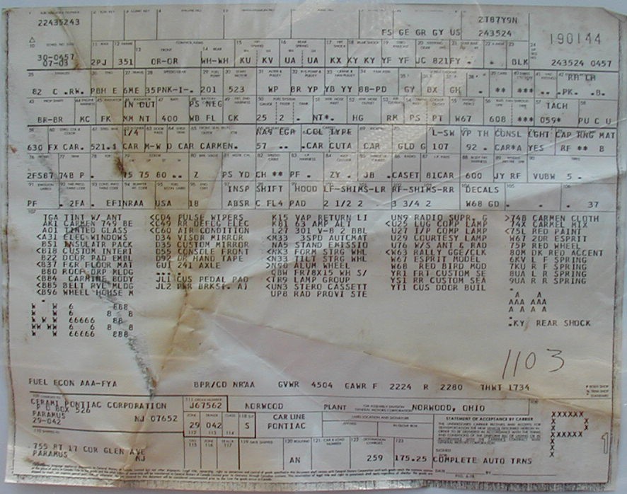 | Finally, we come to James Bryant's 1979 Redbird unrestored survivor. It's a 301 2-barrel car with red Hobnail interior. This is the only Redbird I've ever seen in any car show. How about that? | The Redbird's build sheet was a must-have for my collection. |