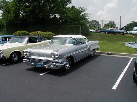 | Here's another item I like, and something you don't see much - it's a 1966 Tempest Sprint Convertbile. This was a real Sprint with the 4-barrel overhead cam six. Way cool. | This 1958 Bonneville had tri-power and was loaded beyond belief. There were several fantastic 1950s models, but I ran out of picture space before I got them photographed. |