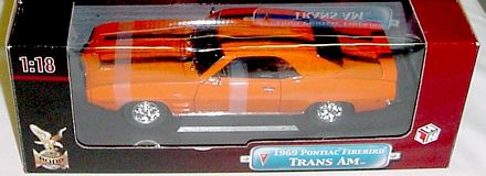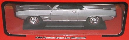 | 1:18 scale 1969 Trans Am was issued in 2001 by Yatming. 1:43 scale 1969 Trans Am was issued in 2002 by K-Line Kruisers. | Both of these 1969 Trans Ams are by Yatming and issued in 2001. The silver Trans Am is part of the Toys R Us exclusive Trans Am Collection (3 car set) commemorating Pontiac's 75th Anniversary. |