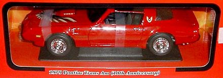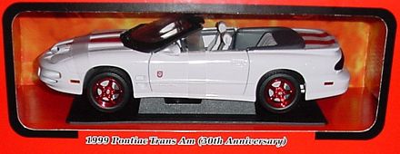 | Yatming 1999 30th Anniversary Trans Am is part of the Toys R Us exclusive Trans Am Collection (3 car set) commemorating Pontiac's 75th Anniversary. | Yatming 1999 30th Anniversary Trans Am in "reversed" color scheme. Two actual 1999 30th Anniversary Trans Ams were created with this paint scheme - One by Pontiac, and a 2nd one by a customer. |