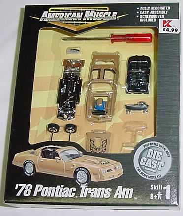 | 1977 Black S/E "Smokey & the Bandit" Trans Am 1:64 scale Body Shop kit by Ertl/RC. This was sold as part of a set of 4 movie and TV cars. These cars had been sold assembled, in a variety of colors, by Racing Champions. | 1978 Trans Am 1:64 scale American Muscle kit. Black and gold kit versions kinda need their interiors swapped, don't they? | ||||||||||||||||