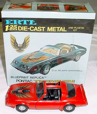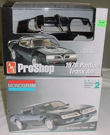 | Here's an old Ertl 1979 Trans Am unopened metal kit and a finished car from an identical kit. | Here's a prepainted plastic 1978 Trans Am Black Special Edition kit (top) and an older 1978 Trans Am kit (bottom). |