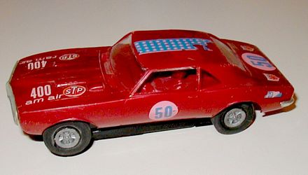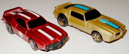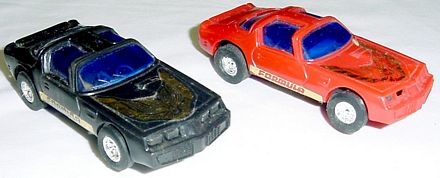 | A couple of 1980-81 Trans Am slot cars... even though they have the Formula stripe and lettering on the bottom. They also have air extractors in the fenders. | 1969 Trans Am Sizzler (made in 1970) with modern Sizzler for comparison. Which one's faster? The vintage 1969 T/A. | ||||||||||||||||