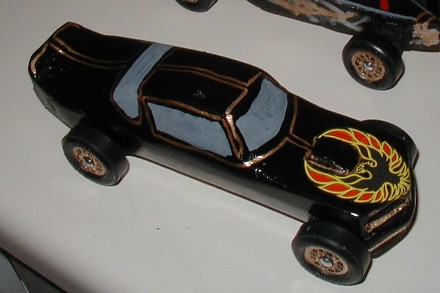 | Here's a 1978 Y88 Gold Special Edition Trans Am that Brian and his son built for Pinewood Derby races in his Cub Scout pack several years ago. They couldn't find a correct hood bird decal so we used what we could find. | Not to be outdone, Joe and his son built this 77 Special Edition for pinewood derby. This car is tall, with a block of wood added on to create the "greenhouse." This car has no fenders, because frankly, we were in a hurry. |