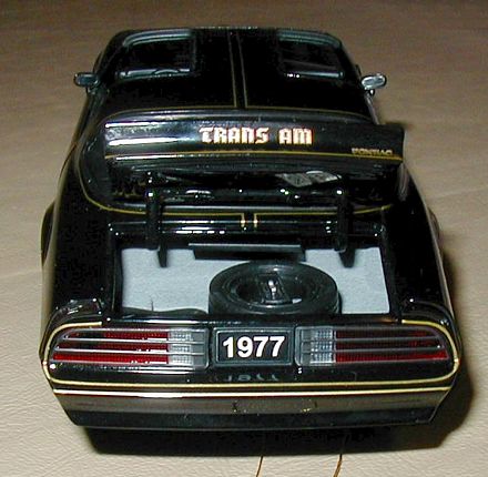 | Ertl 1977 Trans Am issued in May 2002, Hobby Edition 1 of 5,000. Ertl decided to make the trunk open on these cars. Until Ertl comes out with a 1978 Y88 Gold Edition, this is all I have to display with my Gold Edition Trans Am. | Ertl 1977 Trans Am issued in May 2002, Hobby Edition 1 of 5,000. Too bad that all of the Ertl 1977 Trans Ams shown here came with gold dash bezels and gold spoke Formula steering wheels... great for da Bandit T/A... bad for da rest! |