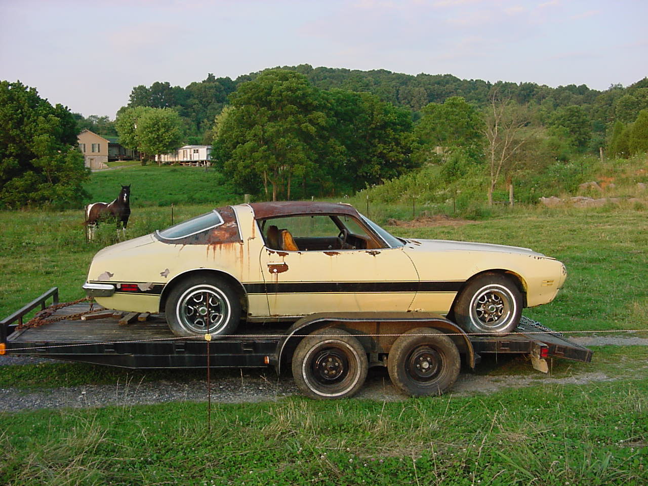 Here is the subject 1972 Firebird on its way... but as with all great adventures... there is a love story within all the action.  Here you can see the mastermind behind the landmines... Mr. Ed... he didn't want to lose his beloved friend and Firebird... and he coerced the other livestock to set the mine field in hopes of protecting his beloved friend.  Mr. Ed can be seen wishing his old friend farewell with a heavy heart...