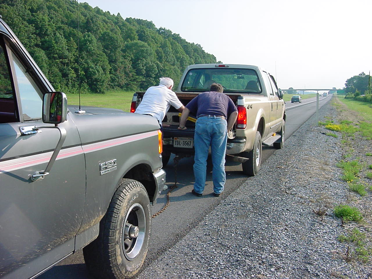 At 17:30 hours (surely you can figure out what time it is by now) Team Hoghead found themselves parked in the emergency lane on an interstate highway... with a potential bad ignition module and no spare parts... sabotage?... could be possible... recent intelligence reports stated that members of the Camaro Restoration And Parts (CRAP) were growing increasingly agitated by Team Hoghead's efforts in the F-Body circles to promote the Firebird.  The call was placed on the Hog-a-phone to whom we'll call "Big Daddy" back at the Top Secret Storage Facility to apprise him of this dire situation...