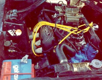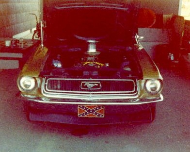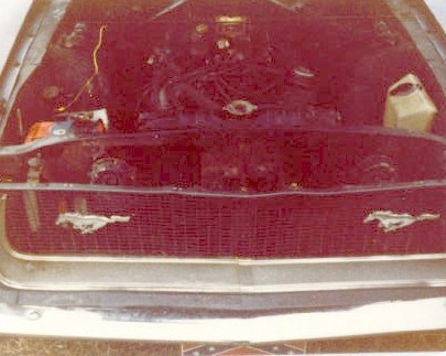 Here's the dirty engine and bent up grille.  I tried to spray paint the engine in the car and that was a waste of time... so out came the engine and transmission.  I was fortunate enough to locate a 1967 Mustang coupe (sitting on the back lot of a used car lot) with a complete 4-speed transmission, bellhousing, pedals, rear axle, etc.  The owner said for $150 I could take off whatever I wanted... so with help from my friends, we removed the complete toploader 4-speed transmission, shifter, pedals, drive shaft, rear axle,... and deluxe interior roof console, door panels, etc.!!  What a deal!!  The only problem we had was when it came time to remove the rear axle.  We couldn't get the bolts out of the springs or the rear axle... so we walked down the street and borrowed a oxy-acetylene torch from the local garage and gas station.  Yes, we did have a small fire... no we didn't have a fire extinguisher or a water source, but we did put it out... and all I'm gonna say is that it involved body fluids and it STUNK!! While the engine was out, I located a set of Cobra valve covers, an aluminum intake, a Holley carburetor, and a set of headers in our local trade paper, the Trading Post Classifieds.  Part of the fun is tracking down parts.  We went to look at the used headers for sale... and when we looked at the junk engine they were still bolted to, there were the very dirty Cobra valve covers!!  Yes, I had to drive the Mustang at least once with open headers before putting some "Orange Peeler" mufflers on it... don't you see the sticker on the right shock tower??  Even better, you can't help but notice the Accel yellow plug wires... but did you notice the CLEAR distributor cap courtesy of J.C. Whitney??  While I had the engine torn down to install these parts, I found out it was a Mexican block 302 which was a BIG plus!!