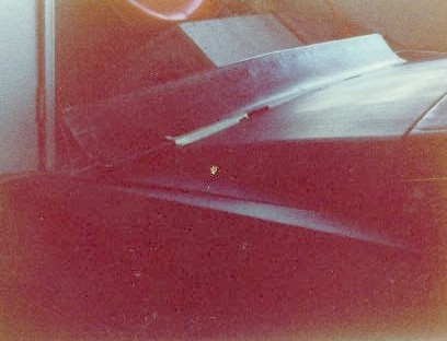 Well, it was back to the field for another picture.  I later found that my driver's door was also full of bondo so I found a 1967 fastback door w/glass in a local junkyard.  You can also see the J.C. Whitney front spoiler that I would later mold to the front valance using fiberglass and bondo... yes I had to be cheap... no big bucks here. Here you see me taking a J.C. Whitney one-piece universal rear spoiler and cutting it into one large piece and two small pieces.  The large piece was bolted to the trunk lid and the two small pieces were bonded to each quarter panel extension with fiberglass.  All of it would be molded in using fiberglass and bondo.  No, I couldn't afford an original Shelby trunk lid and quarter extensions.