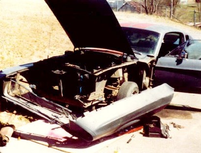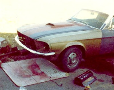 I would later discover that the front fenders were FULL of bondo... I'm talking 1/2" to 3/4" thick bondo... so off they came!!  I bought the front fenders, grille, and front bumper off of a 1968 Mustang. Well, it's beginning to look like a Mustang again!!  Here you can see the high tech tools I had as a teen, a small toolbox and a piece of Masonite!!