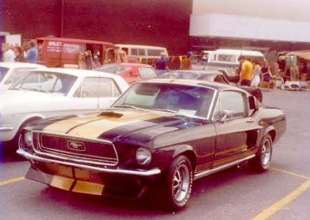 Here's a picture when it was ALMOST done... fresh out of the paint booth from high school.  Yes I painted it and it was FUN!  My shop teacher said only single-color paint jobs... so we asked for forgiveness instead of permission.  The chrome styled steel wheels came from a burnt 1967 Cougar and only needed a good cleaning and polishing.  No, I still hadn't removed those awful shackles... but I did get them off by the 1981 MCA Grand National Show. Here it sits at the 1981 MCA Grand National Show in Kingsport, TN.  The only real high class parts on this Mustang were the correct Shelby brake scoops, air extractors, side stripes, and pop-open gas cap Shelby emblem that I ordered from Tony Branda.  I had to use 1966 GT-350H stripes to get gold side stripes.  I did spring for a new set of tires too.  Can you believe that the total cost of this project (including the purchase price of the Mustang) was $2000!!