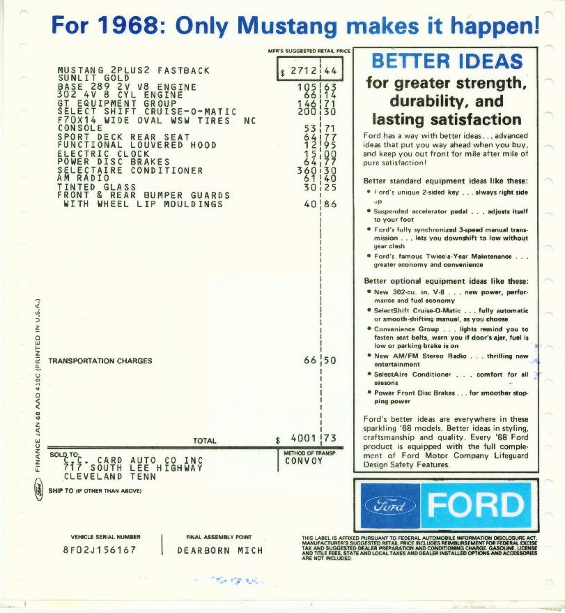 | I do have the original paperwork when this Mustang was purchased brand new... along with the owner's manual, dealer brochure, September 1967 Ford Times presenting the 1968 Fords, and various 1968 ads. | Our 1968 Mustang was featured in the May 1995 issue of the Mustang Times, one of the Reader's Rides in the March 1996 issue of Hot Rod, and in local newspaper articles. |