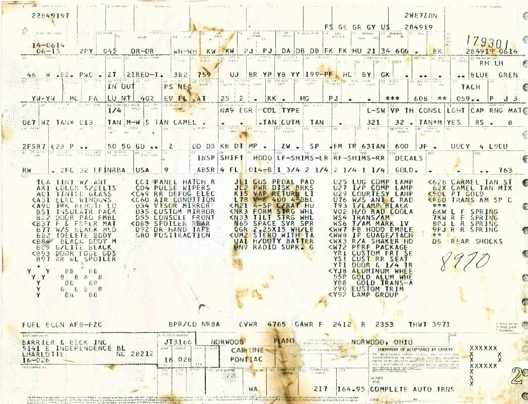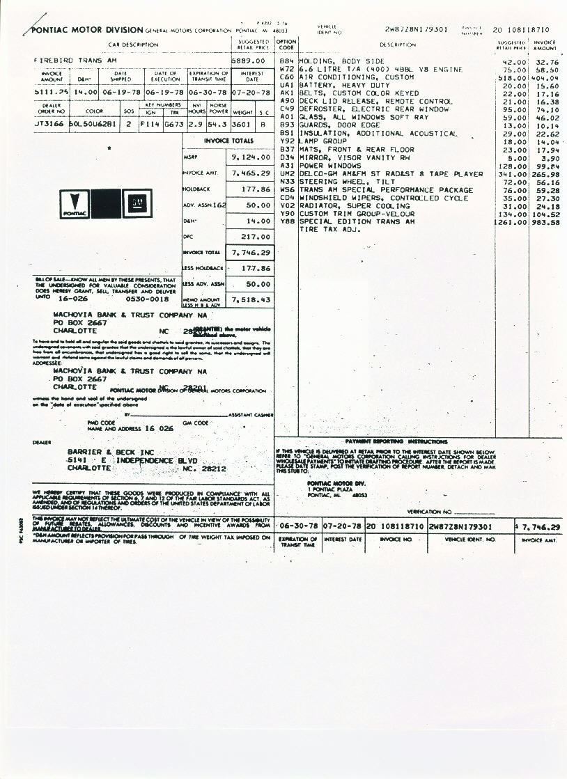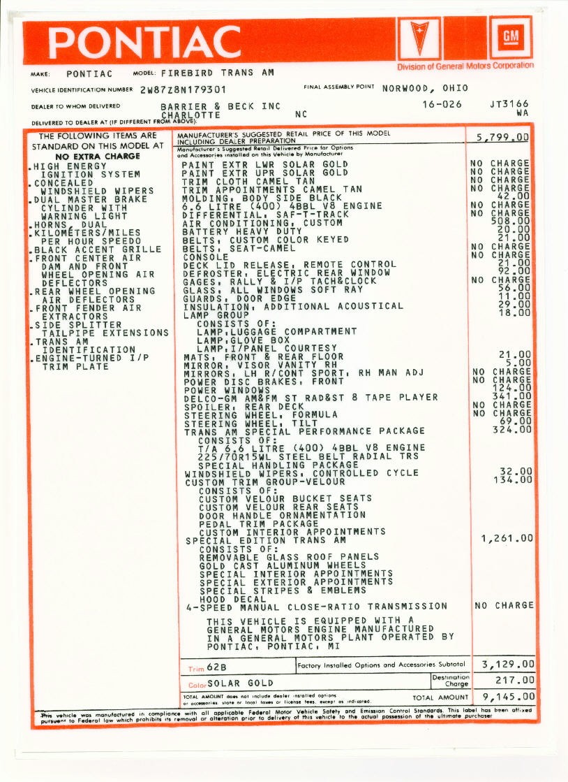 W72 400 cid engine 4-speed WS6 suspension package 1 of 1267 4-speed Y88's built Y88 Gold Special Edition Trans Ams ONLY produced in 1978 Unrestored, original "survivor" Trans Am |