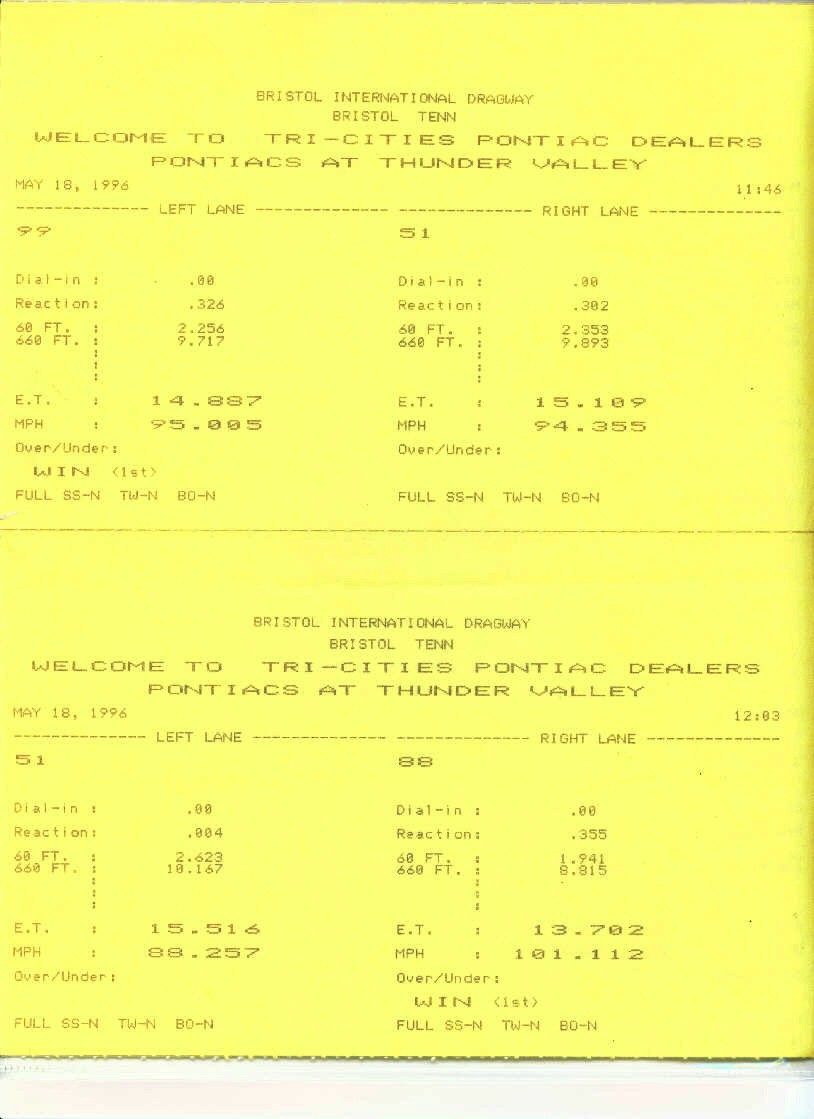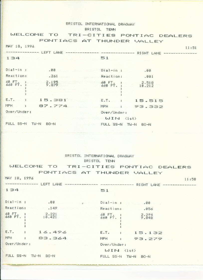 | My car number was 51 so you can see I won a couple... and lost a couple, but had FUN each time!! This was heads-up racing, no bracket racing, no dial-ins, no nothing. I had a couple of respectable reaction times too. | My best time is shown above as a 15.109 sec quarter mile at 94.355 mph. I didn't want to break my Trans Am just to say it runs 14's... so these times are on stock radial tires and leaving the starting line at 1500 rpm... any higher engine rpm leaving the starting line would spin the tires. |