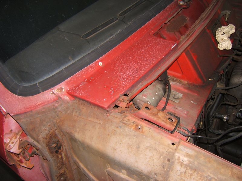 Additional rust in the rain gutter structure at the cowl. The hood hinge is loose in the front.