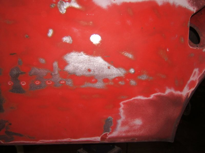 I cleared off this spot to show the original Datsun color. Also, it shows that the original paint is still sound. The newer paint was on top of a white sealer. I don't know the history of this newer paint, but it just fell apart.