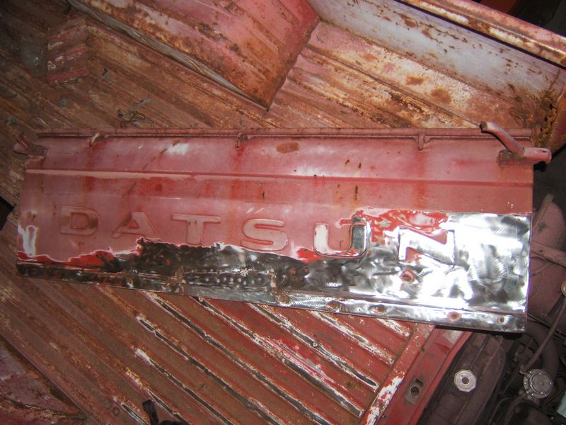 The tailgate is about the worst panel on the whole body. It has had previous rust repair, the only one on the whole truck. The tailgate on a 1970 Datsun Pickup is non-removable. It has basically door hinges with the pins staked in. I had to make some destructive mods to get this thing off.