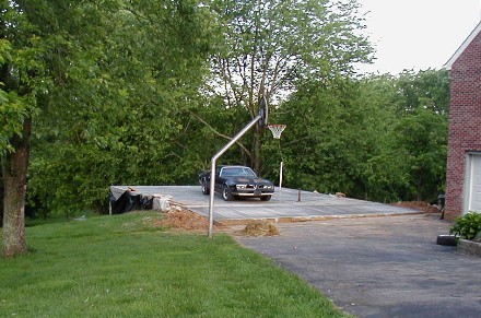 We're back....Well, winter's over, and I guess some of you are wondering what took me so long to get started working again. At the end of may, we've got our landscaping in order around the garage, and some grass is growing. Here a 1978 Formula finds itself temporarily stranded behind wet concrete. This was the first car to actually make it up on top of the garage. We are going to erect the garage mainly in June, so stay tuned. |
