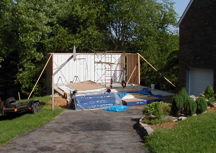 There's good news and bad news. The good news is the walls are up. The bad news is that everything left laying in my driveway has to be lifted up on top of this building. |