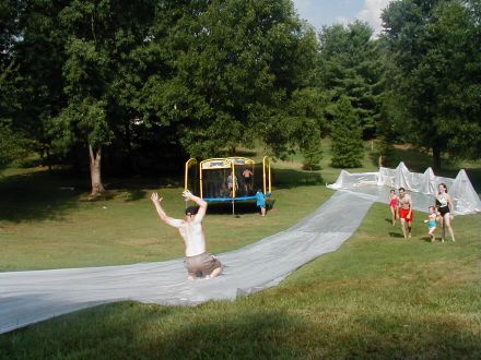 | My back yard is very steep, and is home to an unusual social event where we build a huge waterslide. As you can see, this slope would not really lend itself to a normal shop building. | ![]() |