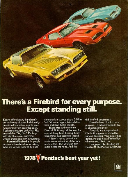 In 1977, Pontiac launched an appearance package for the Esprit called "Skybird". This gave them optional appearance packages on 3 of the 4 Firebird models. In 1978, all three appeared in my favorite Firebird ad, shown at right. Skybirds are the least collectible, but in some ways the most interesting of all these cars.