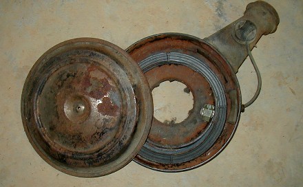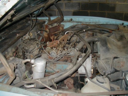 Second, mice lived in it while it was sitting in the yard. They mostly used the hood insulation to build their mouse condominiums, one of which was in the air cleaner. It was the size of a football, and you can see here the rust resulting from the mice peeing on it. That causes rust on things like throttle and choke plates. Mice also created quite a smell in the interior which will probably require all the interior fabric to be replaced.