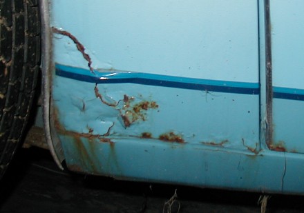 First off, sitting in that grass created some aggressive local spots of rust on what's a pretty solid car. Here's an example; the front of the right rear wheel opening basically exploded. This is the only rust hole. Since the skybird is pretty much worthless, it's a good candidate for a patch panel here.