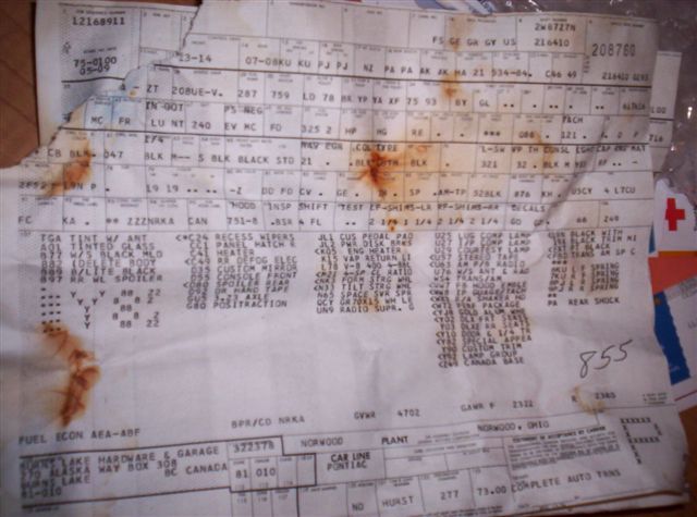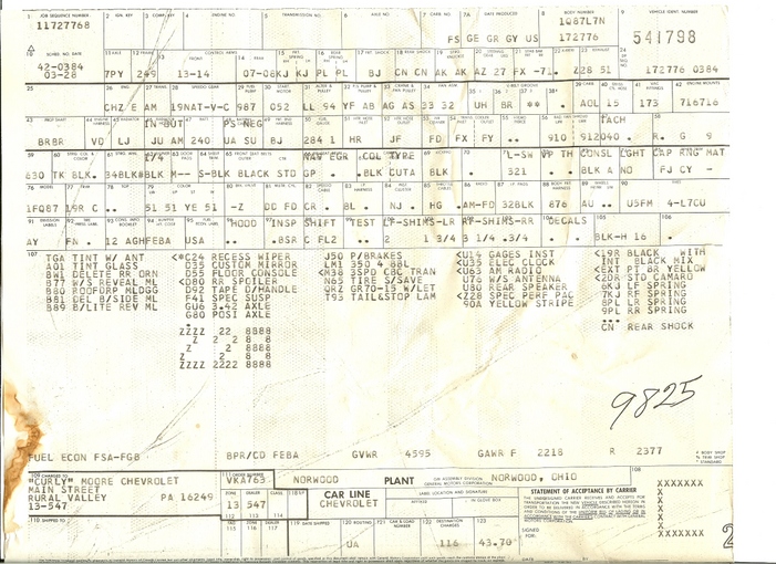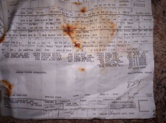 Below, here are a couple more These two were found in one car. These are harder to read, but you can still see that one is a Camaro and one is a Y82. Note the "Akron Tires" note on the Camaro, which was going to a dealer in the Akron area.