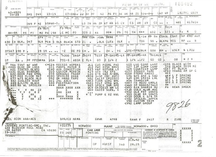The first one is a rare yellow 1977 Trans Am. The VIN sequence is 185491, and the penciled number is 9824.