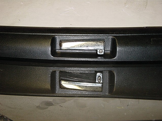 | Here's the ultra-rare high security, double-latching t-top....not really, just a neat reflection. Now remove the Phillips head screw holding on the handle and the trim panel will come off. | |