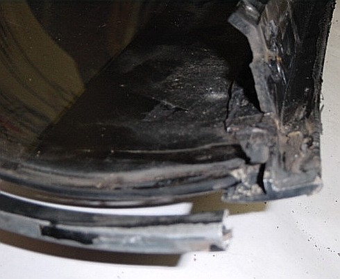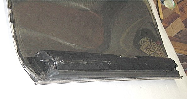 | Here's an end shot showing the aluminum bracket and the aluminum channel that runs around the edge of the t-top glass. The aluminum bracket is glued/sealed to the t-top glass as is the aluminum channel. I think it is possible to replace the aluminum channel that runs around the edge of the t-top glass, but don't think I'd mess with the aluminum bracket. |