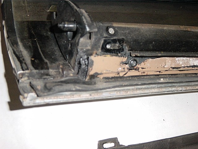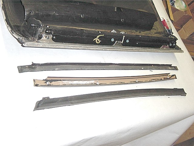| Here you can see the light brown metal channel that holds the weatherstripping. There are 4 Phillips head screws that retain the metal channel that you'll have to remove to get the channel out. Notice the strip of rubber between the metal channel and the drip rail molding. | |